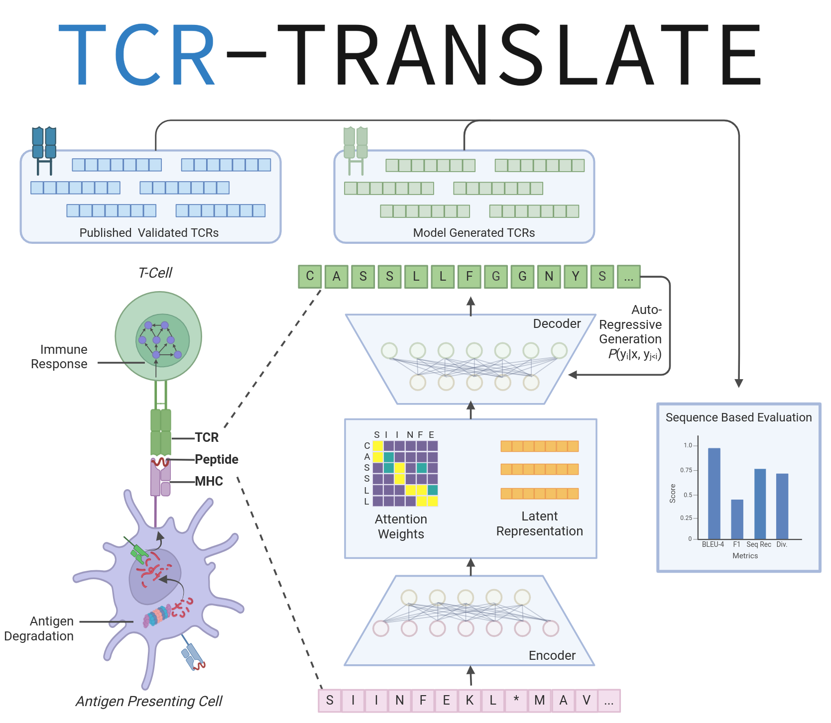 A sequence-to-sequence language model for antigen-specific TCR design that addresses data sparsity through techniques from low-resource machine translation.